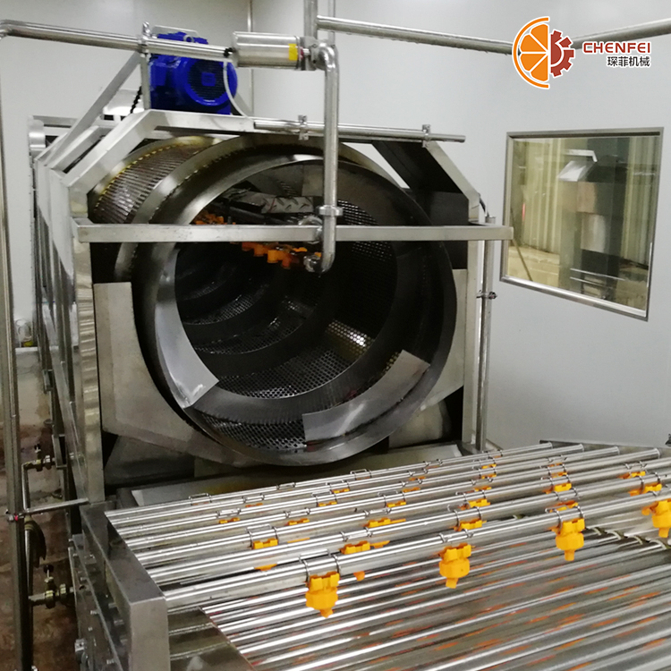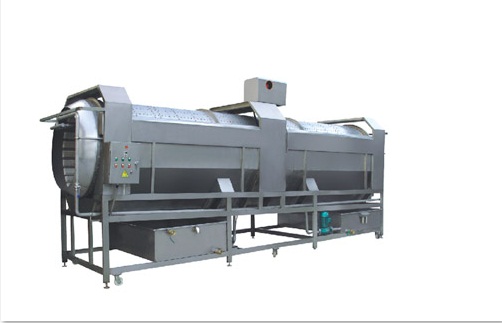 该设备由电机、水泵、滚筒、支架、托轮、板刷、喷淋水管、料斗、盖板、水箱、阀门、传动轴、电机架、电气控制开关等一些零部件组成。通过链条由电机链轮带动长轴上链轮再由过渡轴的链轮和滚筒上的不锈钢链条啮合而使滚筒实现转动。物料进入滚筒后通过喷淋管冲洗以及板刷刷洗达到清洗效果,滚筒下方有两个水箱,靠近出料的清水水箱,进水管接清水,靠近进料边是循环水箱,从冲孔滚筒洗过物料出来的水源,经过水箱中的过滤网过滤二次利用。适用于根菜类蔬菜的清洗。